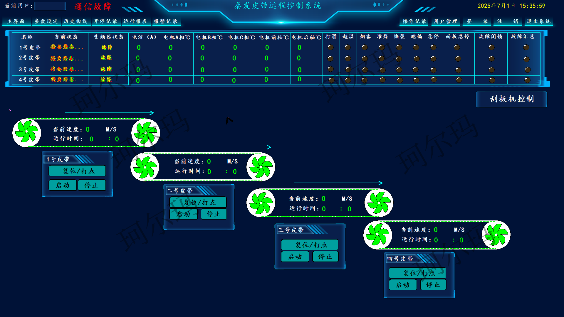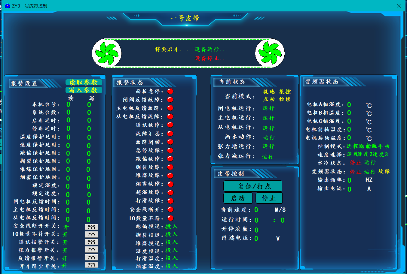 数据采集及监测功能:系统具有低速打滑、机头堆煤、满仓、超温洒水、烟雾、滚筒超温、沿线急停、跑偏、撕裂、张紧力下降、电机、变频器等数据采集、显示及报警功能。