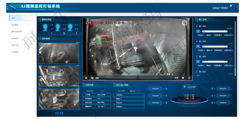 系统由视频智能分析系统软件、视频智能分析装置、智能分析模块、AI智能算法、网络硬盘录像机(服务器模式,组建管理平台)、矿用本安型交换机、矿用本安型无线摄像仪、矿用隔爆兼本安型电源、矿用本安型手机、手机端APP软件平台系统等组成,将井下打钻的作业过程、现场的状况实时图像传送到矿调度指挥中心视频智能分析装置进行视频分析,并向应用系统输出识别结果使调度指挥人员和操作员能够掌握井下钻场重要设备的实时工况,消除安全隐患。